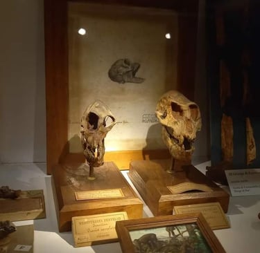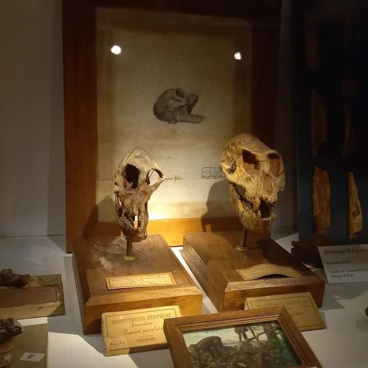 In foto possiamo ammirare due crani di Mesopithecus pentelicus, preservati nel Museo Geologico Capellini di Bologna. Questo genere visse tra il Miocene superiore e il Pliocene superiore (circa 7-5 milioni di anni fa), e i resti vennero trovati in Europa, in Afghanistan e in Cina.