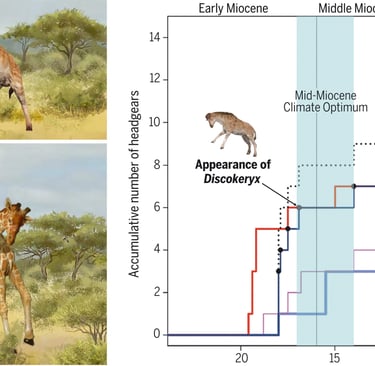 Un antico parente delle giraffe, denominato 𝘿𝙞𝙨𝙘𝙤𝙠𝙚𝙧𝙮𝙭 𝙭𝙞𝙚𝙯𝙝𝙞, presentava un collo che poteva fungere da arma di difesa e di offesa, grazie alla forza delle testate.