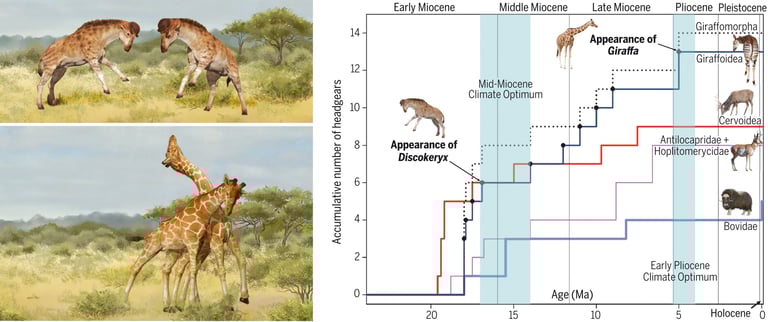 È interessante anche soffermarci su un aspetto prettamente anatomico. Tra gli altri mammiferi, i giraffoidi presentano circa 14 tipi conosciuti di “copricapo” rispetto a caprini, cervidi e bovidi, indicando che potrebbero essere di natura dermica, con forte plasticità e flessibilità durante lo sviluppo. I centri di ossificazione non erano limitati solo a certe aree, come la punta e le superfici esterne nei bovidi, ma erano distribuiti ampiamente all’interno del “copricapo”. Insomma, questi giraffoidi potevano possedere lunghezze del collo e spessori delle vertebre unici, e ciò avrebbe potuto influenzare anche lo “stile” di combattimento. Durante il corso della vita, la morfologia dei copricapi poteva variare anche con l’intensificarsi dei combattimenti. Viene da chiedersi come mai i giraffoidi, nel Miocene medio, divergessero per la tipologia di copricapi, e ciò potrebbe essere stato influenzato anche dalle diverse nicchie lasciate libere durante una lunga fase di aridità.