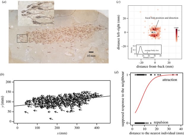 I ricercatori, quindi, hanno condotto una serie di simulazioni dei movimenti dei pesci, e questi fossili "rispettano" le semplici regole che governano le interazioni di ciascun individuo con i suoi vicini, regole che permettono un comportamento di gruppo coordinato come negli attuali pesci: la repulsione verso gli individui vicini e l'attrazione verso gli individui vicini senza che essi si scontrino tra di loro.