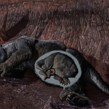 Questo, con molta probabilitร , รจ uno dei piรน bei fossili mai scoperti in quanto ha preservato la madre e il suo feto, prossimo alla nascita. Il reperto รจ stato rinvenuto nella grotta carsica di Toca, nello stato brasiliano di Bahia, ed รจ stato scoperto piรน di 40 anni fa. Sorprendentemente, il lavoro รจ stato pubblicato solamente lo scorso anno. Il feto e la madre appartenevano alla specie ๐๐ค๐ฉ๐๐ง๐ค๐ฉ๐๐๐ง๐๐ช๐ข ๐ข๐๐ฆ๐ช๐๐ฃ๐๐ฃ๐จ๐, vissuta per piรน di 20.000 anni in Brasile, e si tratta di un reperto relativamente completo, come indicato dai numerosi elementi cranio-dentali e postcranici.